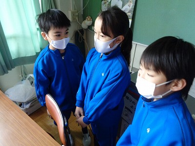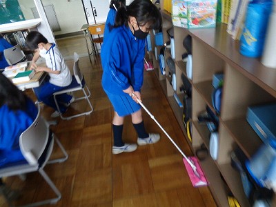 掃除の様子。2年生に進級した時と比べると、ほうきの持ち方や掃き方が上達してきました。