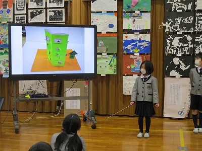 発表内容は、「作品名の意味」や「苦労したところ」、「ここを見てほしい」など、みんなに知ってもらいたいことを自分の言葉で発信することができました。