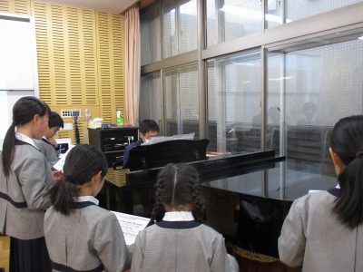 今日の発声練習は、鉄琴の音色に合わせ、声が響く階段で練習しました。