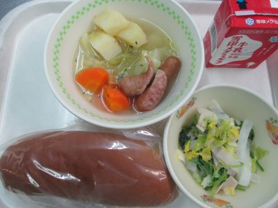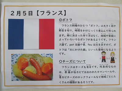 今日は「フランス」料理です。ポトフはじっくり時間をかけて、野菜や肉を煮込んで作ります。フランス語でポトは「鍋」、フは「火」を示すため「火にかけた鍋」という意味になります。決まった作り方が特になく、地域や家庭によって味が違うそうです。