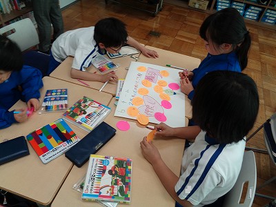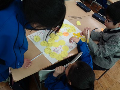 月かげの時間は「われたまどガラス」のお話をもとに、2年生キッズの良いところを画用紙いっぱいにまとめました。