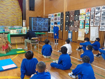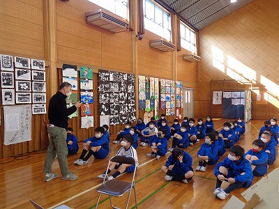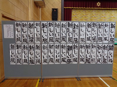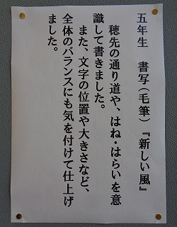 また、書写では「新しい風」を展示しました。鑑賞会では、子ども達が見て欲しいところや苦労したところなどをスピーチしています。