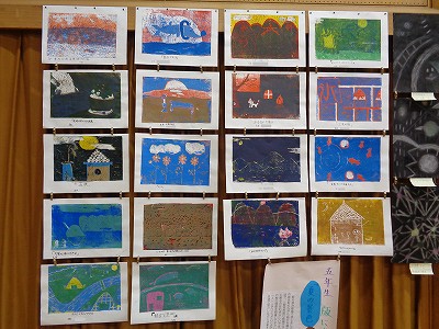 今回、図工の展示では、彫り進み版画「夏の景色・秋の景色」とコンテを使った絵「消してかく」を展示しました。