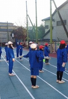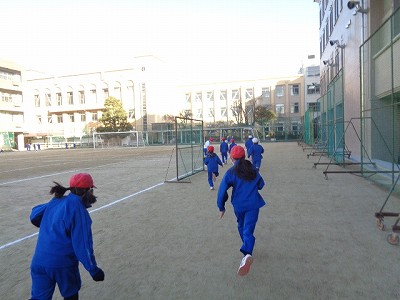 金曜日の朝、根っこマラソンから始まります。手袋、マフラーをつけて、準備体操をしてスタート!