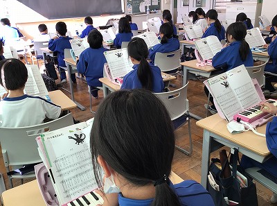 前の時間は、鍵ハモパートに苦戦していました。メロディと全く違う旋律なので、指の動きだけでなく、「メロディにつられてしまう」という難しさです。そのため、念入りに階名唱を行い、“エア練習”にも力を入れました。