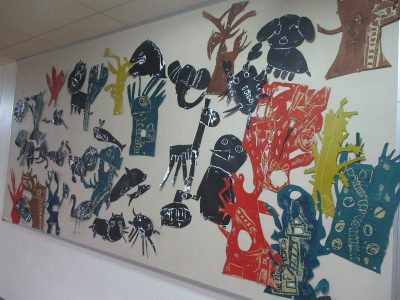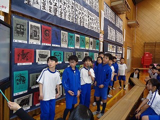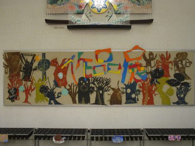 玄関掲示では、版画の版と、カラフルな「作品展」の文字が、文教キッズを出迎えています。