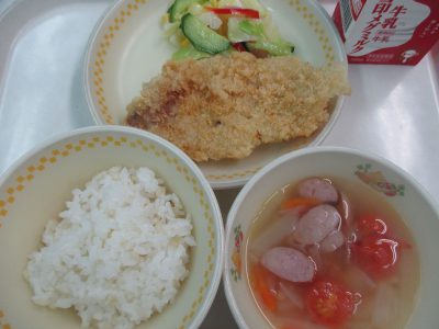 4日目は「イタリア」メニューです。「コトレッタ・アッラ・ミラネーゼ」と言って、小麦粉や卵の他に粉チーズを混ぜて作った衣をはたいて揚げ焼きにする「ミラノ風のカツ」です。いつものカツと比べるとほんの少し、チーズの風味がつきました。