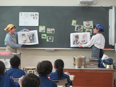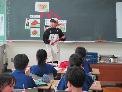 最終日の今日は、給食時間を一緒に過ごした1,2年生の教室で、「あさごはん」「大豆について」の食育指導をしました。