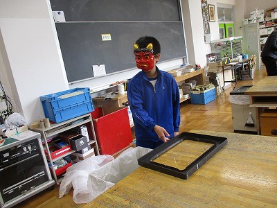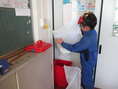 そして、学習室。お面を少し外してゴミの確認中。