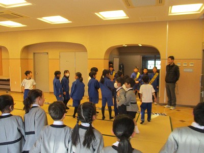 ヨガが終わったところで、児童会本部のメンバーが、あいさつ運動に来てくれました。