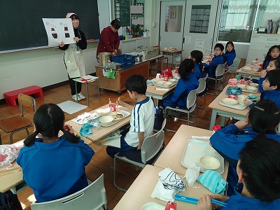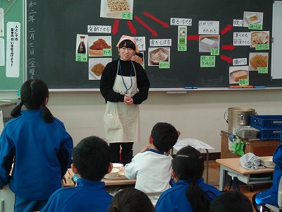 給食の時間では、京都文教短期大学の実習の先生に「大豆」についてのお話を聞きました。