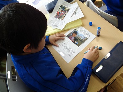 今日は、生まれた頃の写真や節目の写真、お気に入りの一枚をアルバム用のプリントに貼って、お家に方にインタビューしたことを文章にして仕立てました。