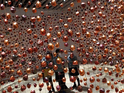 アーティストと企業のコラボレーション作品が11点並ぶ展覧会で、メモを片手にそれぞれの企業の思いとアーティストの思いを受け止めようと一生懸命に鑑賞する姿がありました。