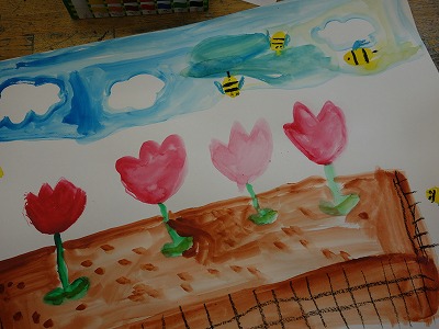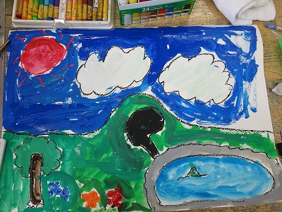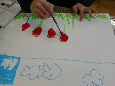 ある程度、クレパスで描き進むと、そろそろと準備を始めます。こわごわ絵の具を塗ると「みてみてー、こんな色になったよ!」「クレパスの所ははじくねー。」など色々な所で声があがりました。