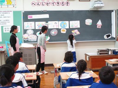 給食の時間は、栄養士実習生の方から「行事食」のお話を聞きました。