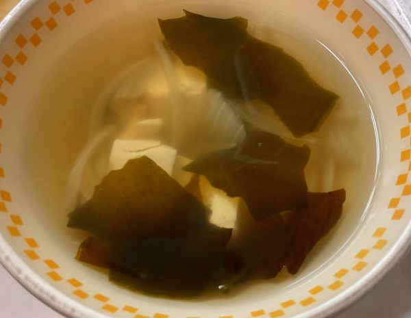 ☆ 「すまし汁」は、豆腐と玉ねぎ、わかめを合わせました。玉ねぎがやわらかくなるまでよく煮込むと野菜のうま味も出汁にしっかり加わります。
