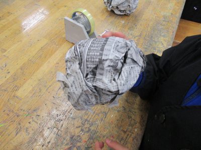 先生から説明を聞いた後は、まず、新聞紙を丸めます。