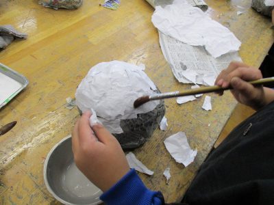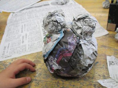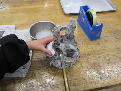 そして、形が決まった後は、くしゃくしゃにした白い紙を貼っていきます。