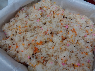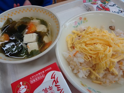 To celebrate the festival, today’s lunch is ”chirashizushi” a special dish made with carrots, shitake, eggs, and small fish called shirasu.