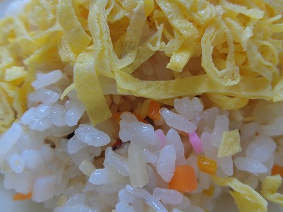 桃の節句は、女の子の健やかな成長と幸せを願う行事です。細かく切って、ごはんに混ぜていますが、6種類ほどの具材が使われています。