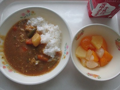 豚バラ肉を使ったカレーライスです。鶏ガラからしっかりスープをとって、カレーを作るので、野菜や肉のうまみがしっかりつまったカレーライスが出来上がります。6年生も、小学校で食べるカレーライスは今日が最後でした。黙々とですが、味わって食べている様子でした。