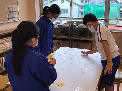 6時間目の社会は、自分達の作った「都道府県カルタ」を使って実際に遊びました。他の班が作ったカルタでも遊んでみると、「自分の班と読み札が似てる!」という発見も。はじめはお手つきもたくさんありましたが、慣れてくると県名の形で判断できるようになっていました。