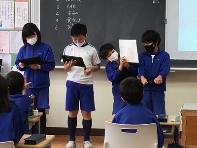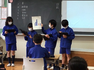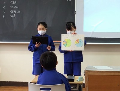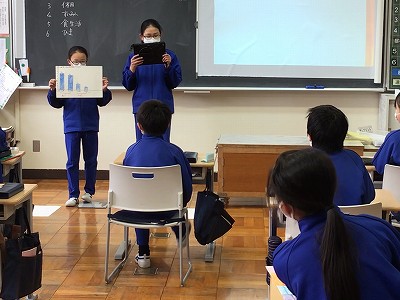 今日の一時間目は「調べよう生活調査隊」の発表会を行いました。どのチームもしっかりと練習をして、とてもすばらしい発表となりました。休日の過ごし方や、読書、睡眠、食生活についてなど、アンケートを取ることによって、クラスの実態を知ることができました。