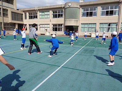 多くの3年生がグラウンドに出て、ドッジボールに参加していました。