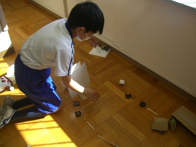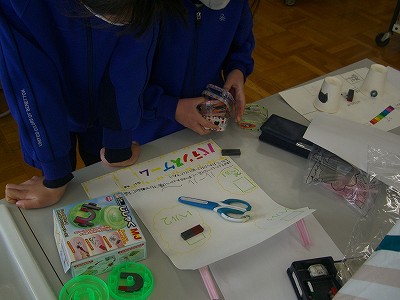 今日は、自分たちが作ったおもちゃで遊びます。前回の中間発表会で気づいた修正点を改善し、パワーアップしたおもちゃを準備しました。