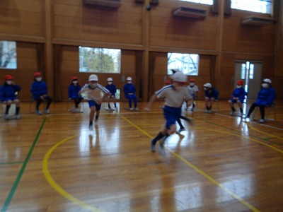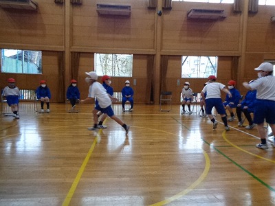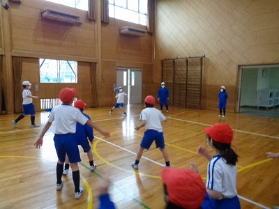 まずは、みんなで「何でもバスケット」。鬼役を決めてスタートです。