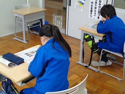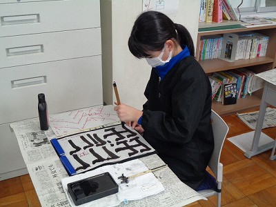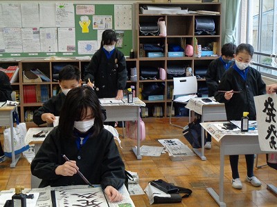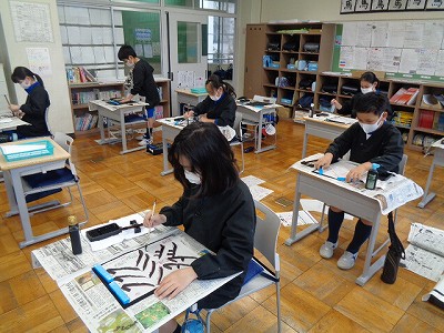 1・2時間目は、3学期最後となる毛筆での書写を行いました。4年生もあと3週間となり、今日は新5年生に向けての思いも込めて、「出発」という字に挑戦します。