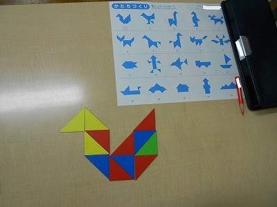 算数セットに入っている「形作り」のシートを見ながら、色板12枚で色々な形を作ります。
