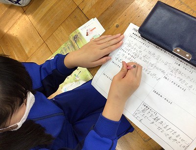 「クラリネットの低くてゆっくりと演奏しているところが、のんびりやのネコにぴったり」「ファゴットはクラリネットよりさらに大きくて長いから、音がもっと低く聞こえる。おじいさんが、ピーターに注意しているみたい」と、楽しみながら鑑賞プリントを書き進めていました。