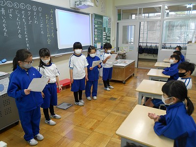 「みんなの声を聞いて読むこと」「最初の言葉をはっきり読むこと」「リズム・テンポ」「声の調子」など、これまでに学習したことを思い出しながら読みました。