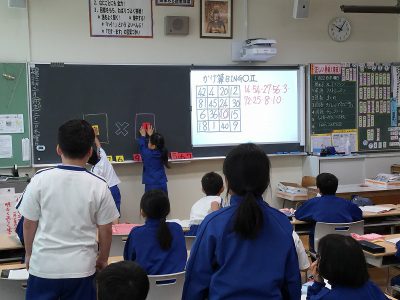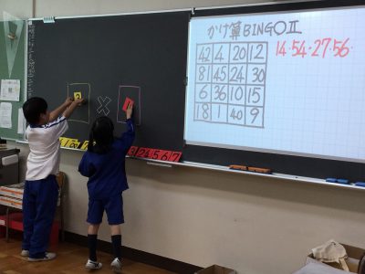 「かけざ~ん、ビンゴ~」と声を合わせ、黒板に数のカードを貼り付けます。