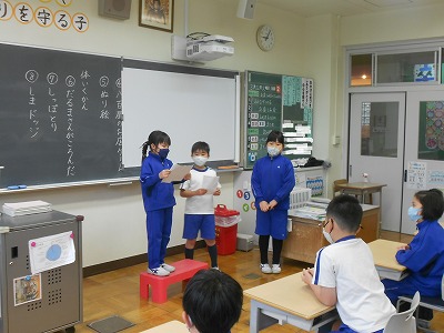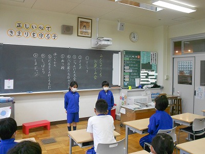 学級代表の2人が前に出て、“みんなで楽しく過ごしましょう!”“静かに話を聞いて協力しましょう!”と呼びかけてくれました。