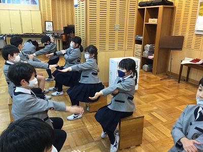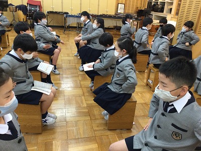 校歌や聖歌を歌う練習した後は、教科書やレパートリー集に載っている遊び歌を歌って発表して楽しみました。