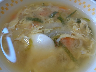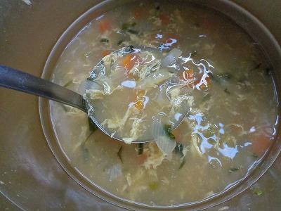 人参のオレンジとネギの緑色がきれいな味噌汁になりました。卵が入ると、味噌と合わさって味噌汁がまろやかになります。野菜と卵の組み合わせで、おいしくいただきました。