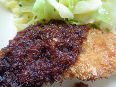 サクッと揚げあがるよう、2度揚げして調理しています。ソースはカツの半分だけにつけました。