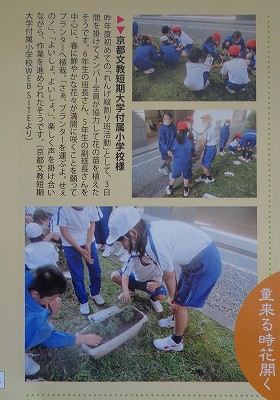 公益財団法人「花と緑の農芸財団」の機関誌(設立35周年で通巻100号の記念誌・2021年春号)に、本校の縦割りれんげ班での苗植えの様子が掲載されました。