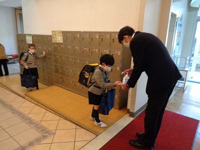 玄関では、校長先生が子ども達に手の消毒をしながら、一人ひとりに声をかけます。