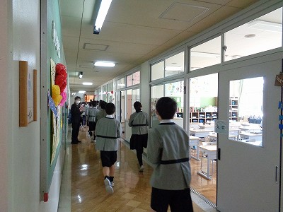 最高学年の5年生が体育館に向かいます。