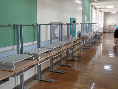 廊下には、みんなの机・いすが並びました。力合わせが光る時間になりました。