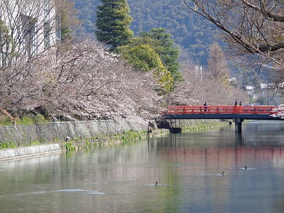 平安神宮前の赤い慶流橋と桜・疏水が素敵です。