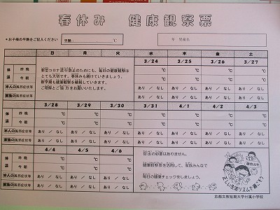 今年の春休みは「春休み健康観察票」をお配りしています。新型コロナ流行防止のためにも、今までと同じように「体温チェックの健康観察」を続けていきましょう。
