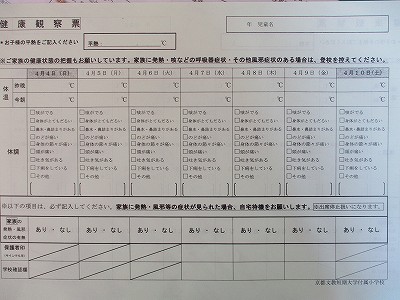 また、新学期からの健康観察票もお配りしています。