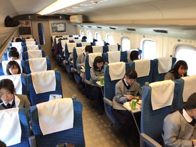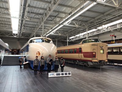 最初の見学地「リニア鉄道館」に着きました。見学後、新幹線の車両内でお弁当を頂きました。