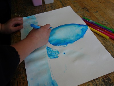 この児童は「ぽとんとおちた みずひとしずく」の言葉から、このような形と色を生み出しました。