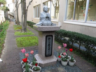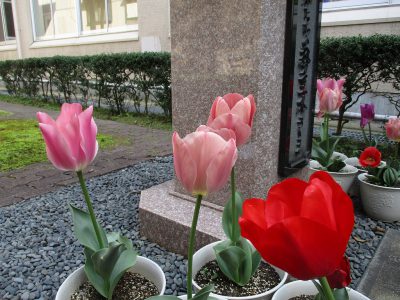 小学校玄関前の「勢至丸さま」は、色とりどりのチューリップをご覧になっています・・・