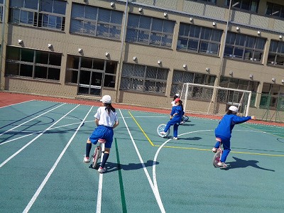 その後は、一輪車にチャレンジです。空中乗りや、途中で止まる技など、それぞれが課題を持って一輪車に取り組みました!